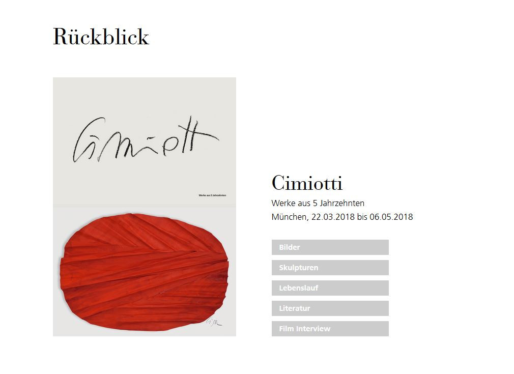 2018 * Edwin Scharff Museum, “Emil Cimiotti: Retrospektive zum 90. Geburtstag”, Neu Ulm, 25.02.- 21.05.2018. - PLAKAT - - COVER - - FLYER A - - FLYER B - * Stiftung Schloß Neuhardenberg, Neuhardenberg, “Cimiotti”, 17.03.-29.04.2018. - COVER - - FLYER - * Galerie 20/21 Modern & Contemporary Art, “Emil Cimiotti: Werke aus 5 Jahrzehnten”, München, 22.03.-06.05.2018. - k.P. - - FLYER - * Bayerische Akademie der Schönen Künste München, “Emil Cimiotti: Papierreliefs & Plastiken”, München, 08.11.2018-14.12.2018. - FLYER - * Emil Cimiotti auf der “ART Karlsruhe” bei Galerie Cyprian Brenner GCB / Südwestgalerie, 22.02.-25.02.2018. - PLAKAT - * Emil Cimiotti auf der “TEFAF Maastricht”t, bei Galerie Haas Zürich, 10.03.-18.03.2018. - PLAKAT - - FOTO 1 - - FOTO 2 - * Emil Cimiotti auf der “ART Cologne” bei Galerie Haas Zürich, 19.04.-22.04.2018. - PLAKAT - - FOTO - * Villa Wessel Iserlohn, “Sammlung Hennemann - INFORMEL”, Iserlohn, 05.05.-01.07.2018. - PLAKAT - - FLYER - - FOTO 1 - - FOTO 2 - * Emil Cimiotti auf der “ART Basel 2018” bei Galerie Haas Zürich, 14.06.-17.06.2018. - PLAKAT - * Galerie 20/21 München 2018 bei Taylor Wessing, “Gruppenausstellung der Galerie”, u.a. Emil Cimiotti, K.O. Götz, Lothar Quinte, Jan Voss, München, 12.09.2018- Ende Juli 2019. - k.P. - * Centre of Contemporary Art Znaki Czasu in Torun (Polen),” Privatsammlung Michael Haas Berlin”, Torun. 11.11.2018-13.01.2019. * Emil Cimiotti auf der “ART Düsseldorf” bei Galerie Haas Zürich, Düsseldorf. 16.11.-18.11.2018. - PLAKAT - - FOTO 1 - - FOTO 2 - * Emil Cimiotti auf der “COFA Cologne Fine ART” bei Galerie Koch Hannover, Köln, 22.11.-25.11.2018. - PLAKAT - - FOTO -