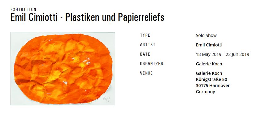 2019 * Galerie Koch Hannover, “Emil Cimiotti - Plastiken und Papierreliefs”, Hannover, 18.05.-22.06.2019. - PLAKAT - - FOTO 1 - - FOTO 2 - - FOTO 3 - * Emil Cimiotti auf der “ART Karlsruhe” bei Galerie Cyprian Brenner GCB / Südwestgalerie, 21.02.-24.02.2019. - PLAKAT - * Emil Cimiotti auf der “TEFAF Maastricht”, bei Galerie Haas Zürich, 14.03.-24.03.2019. - PLAKAT - - FOTO 1 - - FOTO 2 - * Emil Cimiotti auf der “ART Cologne” bei Galerie Haas Zürich, 10.04.-14.04.2019. - PLAKAT - - FOTO - * Emil Cimiotti auf der “ART Basel” bei Galerie Haas Zürich, 12.06.-16.06.2019. - PLAKAT - - COVER - - FOTO - * Galerie Michael Haas Berlin, “cdghlmtw, Gemeinschaftsausstellung der Galerie”, Berlin, 21.06.-27.07.2019. - PLAKAT - * Galerie Cyprian Brenner GCB / Südwestgalerie, “Fünf Jahre GCB”, Gemeinschaftsausstellung der Galerie, Hüttlingen / Niederalfingen, 12.09.-03.11.2019. * Emil Cimiotti auf der “ART Düsseldorf” bei Galerie Haas Zürich, 15.11.-17.11.2019. - PLAKAT - - FOTO - * Emil Cimiotti auf der “Cologne Fine ART & Design”, Köln, bei Galerie Koch Hannover, 20.11.-24.11.2019. - PLAKAT - - FOTO -