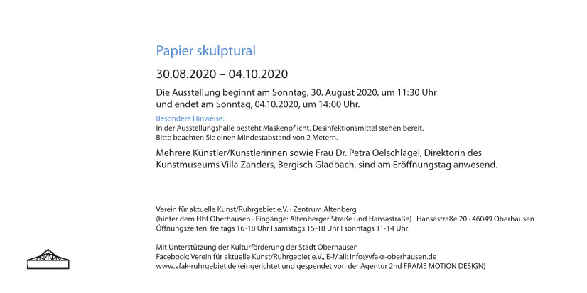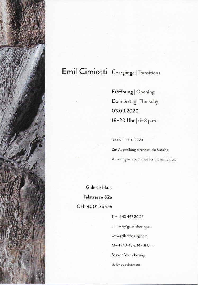 2020 * Galerie Haas, Zürich, Emil Cimiotti “Übergänge” - Skulpturen und Zeichnungen”, Zürich, 03.09.-20.10.2020. - COVER - - FLYER 1 - - FLYER 2 - - FOTO 1 - - FOTO 2 - * Villa Wessel Iserlohn, “Emil Cimiotti”, Iserlohn, 02.10.-27.12.2020. - PLAKAT - - FLYER 1 - - FLYER 2 - - LINK - - FOTO - * Galerie Koch, “65 Jahre Galerie Koch”, Hannover, 20.02.2020-30.05.2020. - FLYER - - FOTO - * Emil Cimiotti auf der “TEFAF Maastricht”, bei Galerie Haas Zürich, 05.03.-15.03.2020. - PLAKAT - - FOTO 1 - - FOTO 2 - * Städtische Galerie Wolfsburg, “Michael Müller - Deine Kunst - Neupräsentation der Sammlung der Galerie”, Wolfsburg, 26.05.-09.08.2020. - PLAKAT - - FLYER - * Galerie Haas Berlin/Zürich, “Abstand Episode 2 - Gegenwart”, Berlin, 07.06.-30.08.2020. - COVER - * Verein für aktuelle Kunst / Ruhrgebiet e.V., Zentrum Altenberg,” Papier Skulptura”l, Oberhausen, 30.08.-04.10.2020. - PLAKAT - - FLYER 1 - - FLYER 2 - - FOTO - * Galerie Haas Berlin/Zürich, “Abstand Episode 3 - Papier”, Berlin, 10.09.-31.10.2020. - COVER - - FOTO - * Galerie Koch, “Unter freiem Himmel”, Hannover, 12.09.2020-10.10.2020. - FLYER - * Stiftung van de Loo München, “Informelle Aufbrüche. Aus den ersten Jahren der Galerie”, München, 01.10.-23.10.2020. - FLYER - * GCB Galerie Cyprian Brenner, Schwäbisch Hall / Niederalfingen / Augsburg, “Bestandspräsentation”, ab November 2020. - COVER -