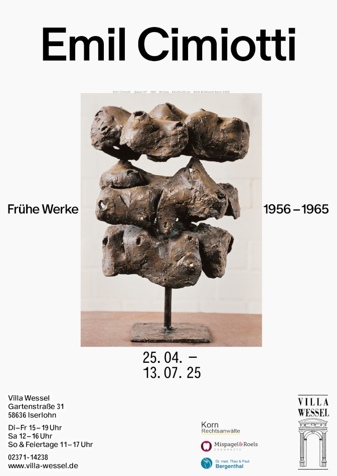 2025 * Villa Wessel Iserlohn, “Emil Cimiotti / Frühe Werke 1956-1965”, Iserlohn, 25.04.-13.07.2025. - PLAKAT - - FLYER 1 - - FLYER 2 - - FOTO - * Galerie Beck & Eggeling, “Emil Cimiotti im Dialog mit Baumeister, K.-Y. Chun, Graubner, Hoehme und Miró”, Düsseldorf, 06.06.-28.08.2025 (verlängert). - FLYER - - FOTO - * Kunstmuseum Bochum, “Sichtbar - Die eigene Sammlung”, Bochum, 05.04.2020-31.12.2025. - FLYER - - FOTO - * Emil Schumacher Museum Hagen, “Durchbruch II”, Sammlungspräsentation der späten 1950er Jahre, mit Zeitgenossen, Hagen, 16.02.-13.04.2025. - FLYER - - FOTO -