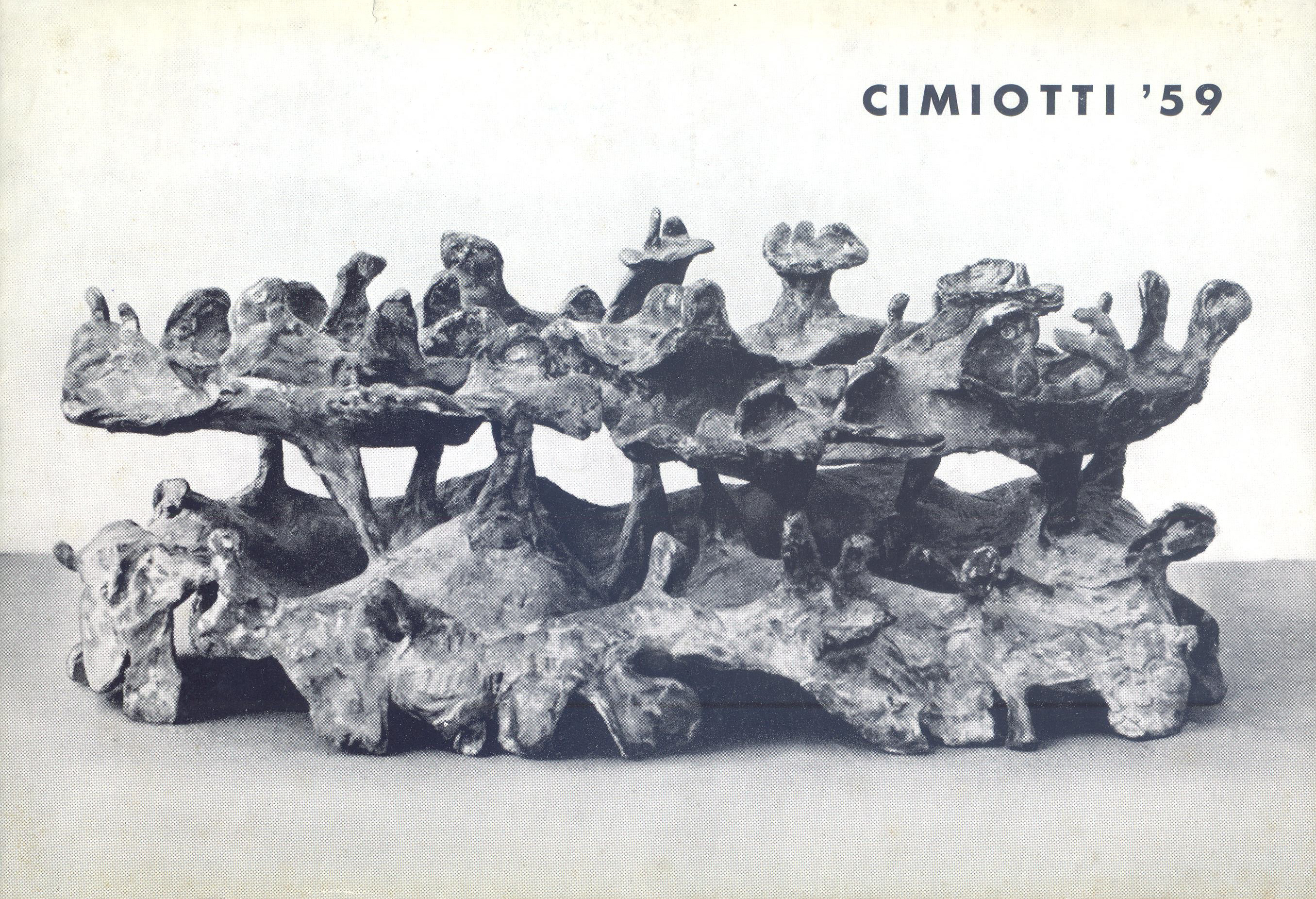 Cimiotti “Plastiken und Zeichnungen” Hrsg.: Galerie Gunar, Düsseldorf Ausstellung: Eröffnung 08. Dezember 1958 Redner: Albert Schulze Vellinghausen 6 Seiten mit drei abgebildeten Bronzen: “Plastik II” von 1957, “Figurengruppe IX” von 1958 und “Plastik VI” von 1958.