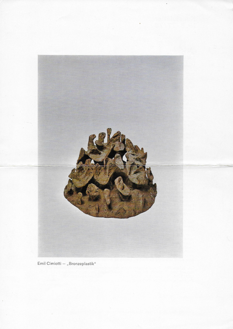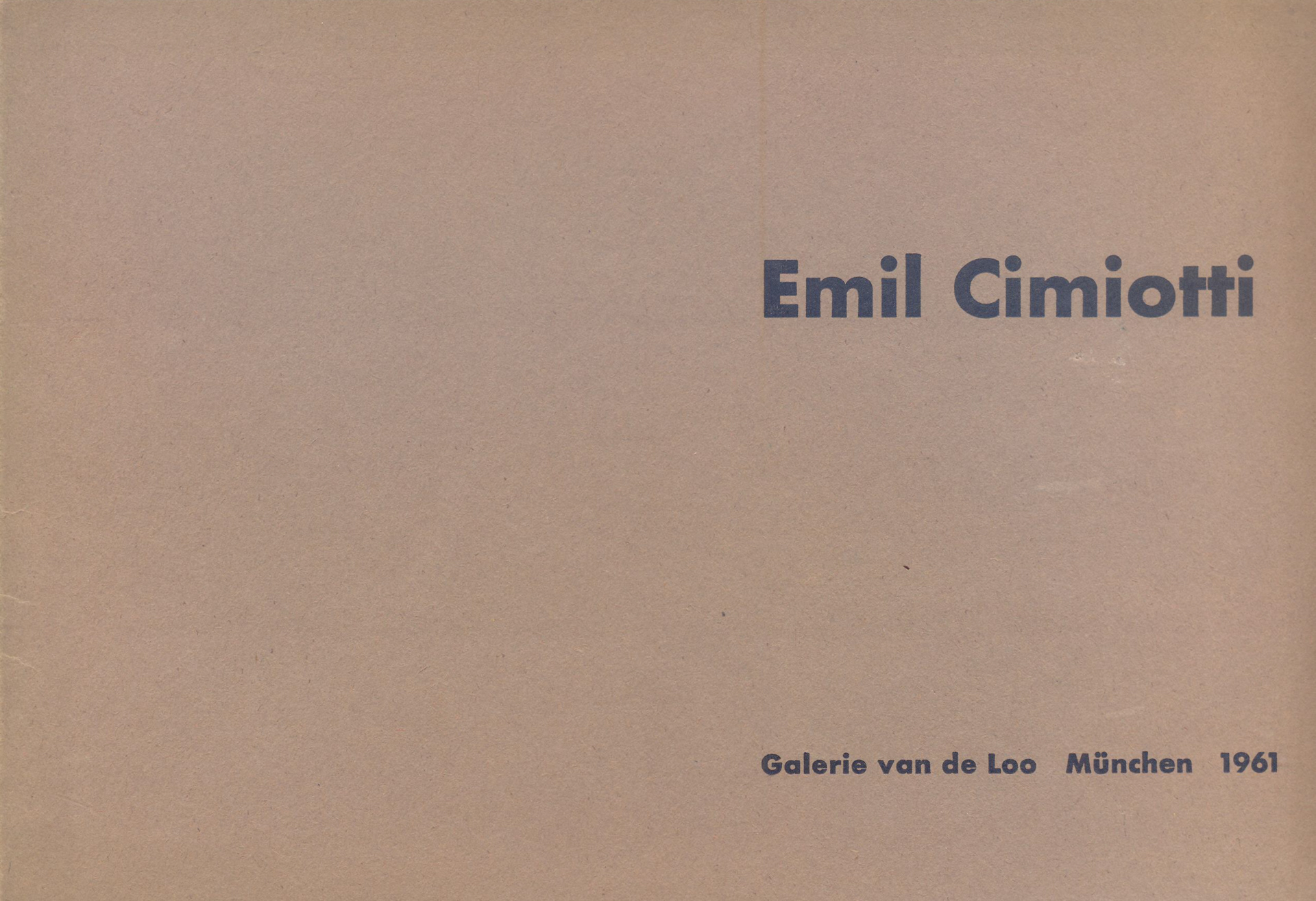 Emil Cimiotti “Plastiken und Zeichnungen” Hrsg.: Galerie van de Loo, München 1961 Ausstellung: 17. Januar 1961 - 14. Februar 1961 Einführungstext: Juliane Roh 16 Seiten mit 7 abgebildeten Bronzen: “Der Berg und seine Wolken I” 1959, “Der Wald” 1959, “Vulkano II” 1959, “Kleines Gebirge” 1959, “Römische Landschaft” 1960, “Atlas I” 1961 und “Kleines Waldstück” 1961.