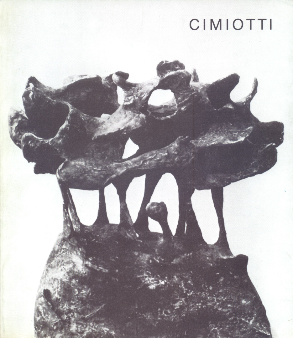 Cimiotti Städtisches Museum am Ritterplan, Göttingen Ausstellung: 11. September 1966 - 23. Oktober 1966 Einführungstext: John Anthony Thwaites 19 Seiten mit 10 abgebildeten Bronzen und einem Relief: “Der Wald” 1959, “Kleines Gebirge” 1959, “Landschaft” 1960, “Landschaftliches Motiv I” 1962, “Paar” 1964/65, “Muschel” 1964/65, “Landschaftliches Motiv II” 1963, “Vegetatives Motiv III” 1964/65, “Kreuzblume” 1964/65, “Blume III” von 1964/65 sowie dem Relief “Betonwand in Mühlhausen bei Stuttgart”.