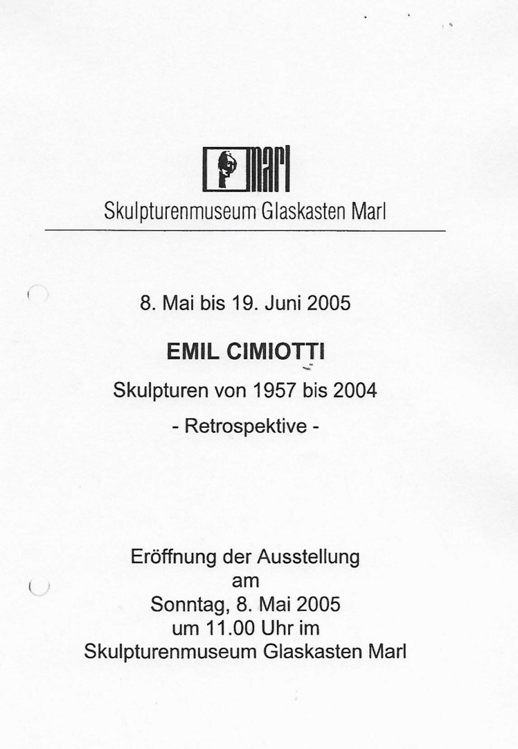 Emil Cimiotti “Skulpturen von 1957 bis 2004 - Retrospektive” Flyer zur Ausstellung 4 Seiten Skulpturenmuseum Glaskasten Marl Ausstellung: 08. Mai 2005 - 19. Juni 2005