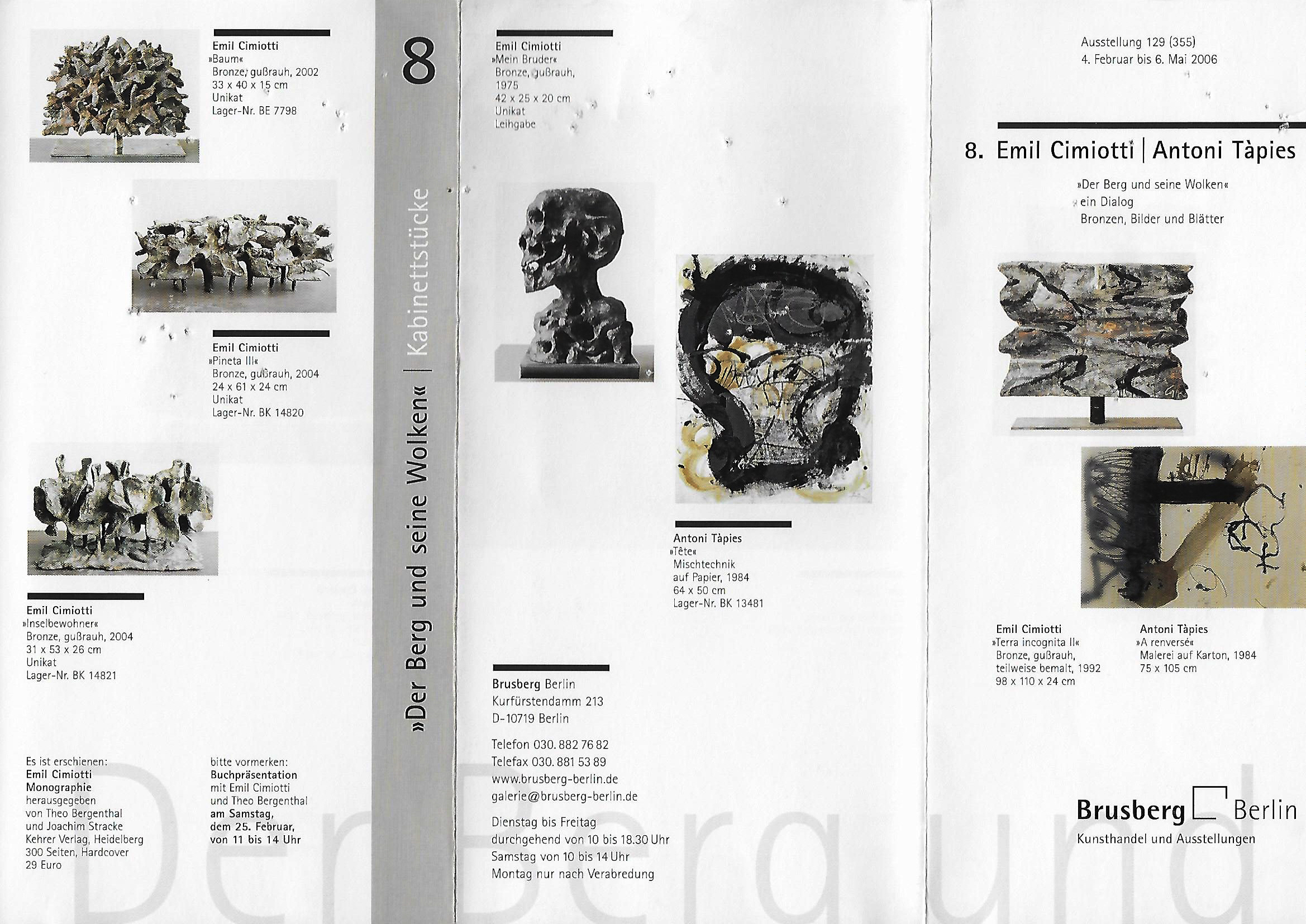 Emil Cimiotti / Antoni Tápies “Der Berg und seine Wolken” - ein Dialog. Bronzen, Bilder und Blätter Flyer zur Ausstellung, 6 Seiten - 9 farbige Abbildungen Brusberg Berlin - Kunsthandel und Ausstellungen Ausstellung: 04. Februar 2006 - 06. Mai 2006