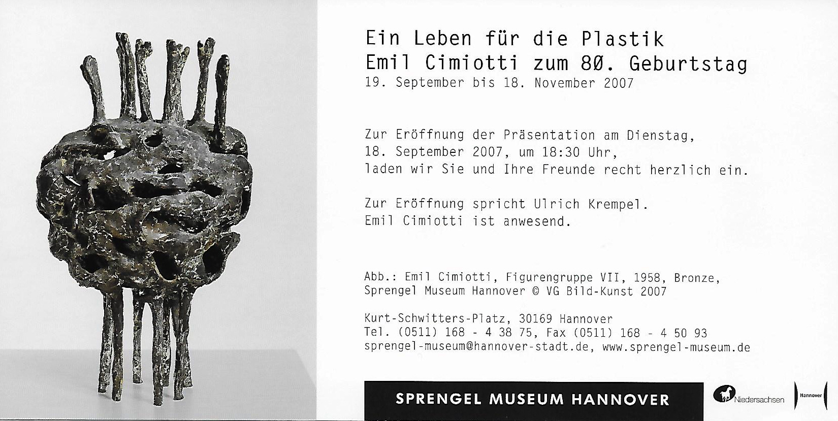 Emil Cimiotti “Ein Leben für die Plastik / Emil Cimiotti zum 80. Geburtstag” Flyer zur Ausstellung, 1 Seiten - 1 farbige Abbildung Sprengel Museum Hannover Ausstellung: 19. September 2007 - 18. November 2007