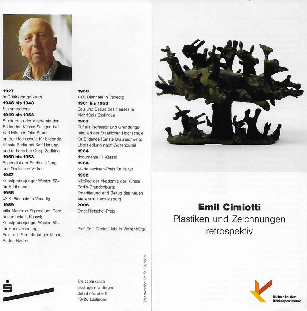 Emil Cimiotti “Strukturen, Plastiken 1958-2004” Hrsg.: Evangelischer Stadtkirchenverband Hannover, 2004 Ausstellung: 09. Juni 2004 - 21. Juli 2004 Evangelische Marktkirche (Georgii et Jacobi) Hannover Einführungstext: Christoph Zuschlag 40 Seiten mit 20 Abbildungen (16 Bronzen, 1 Porträt, 3 Szenen). Cover-Abbildung Bronze “Der Baum” von 1961. Einladungsflyer dergl. mit “Der Baum”.
