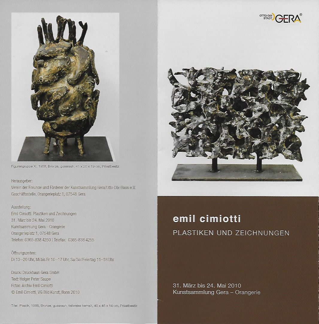 Emil Cimiotti “Plastiken und Zeichnungen” Flyer zur Ausstellung, 8 Seiten - 7 farbige Abbildungen Kunstsammlung Gera - Orangerie Ausstellung: 31. März 2010 - 24. Mai 2010 7 Bronzen abgebildet: “Figurengruppe XI” 1958, “Waldstück” 1976, “Christine im Profil II” 1981/83, “Eremit (spätere Fassung)” 1988, “Kleines Gebirge” 2000, “Für Heraklit (Strukturen)” 2002 sowie “Bolide III” von 2008.