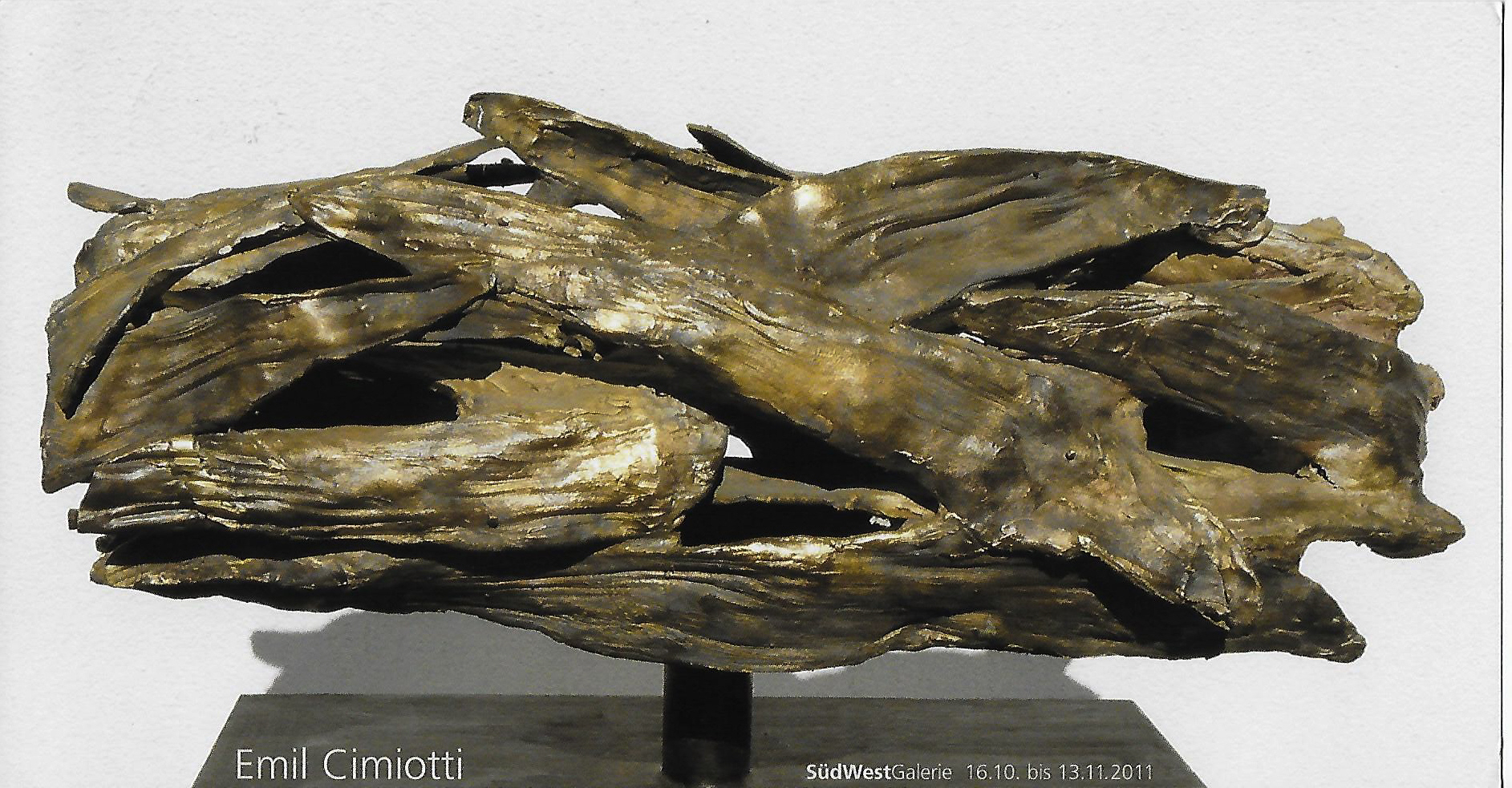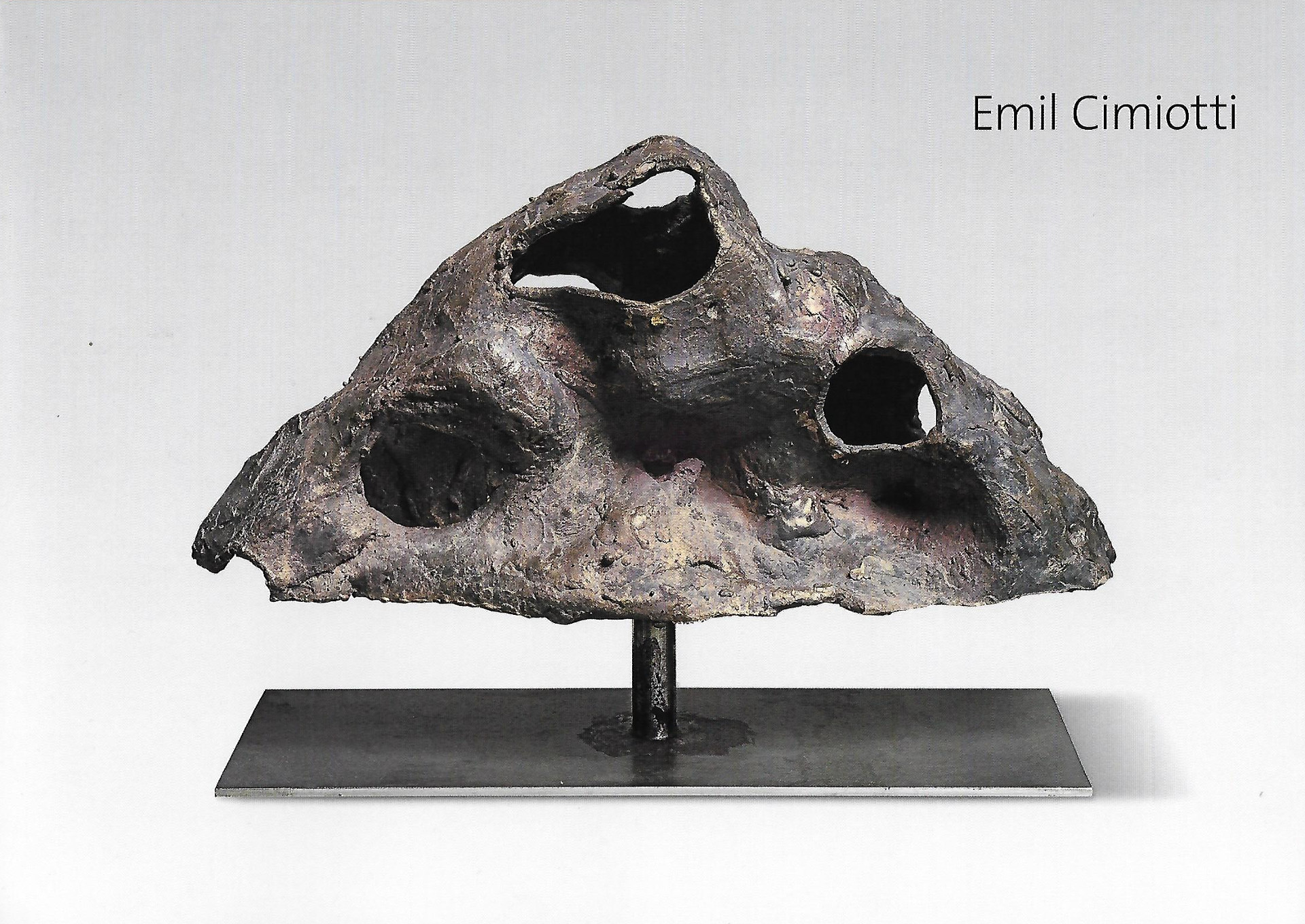 Emil Cimiotti “Werkskizzen / Plastiken” Galerie Schmücking, Braunschweig 21. April 2002 - 17. Mai 2002 Flyer, 4 Seiten. Farbig abgebildet: Bronze “Kavernen” von 1998.