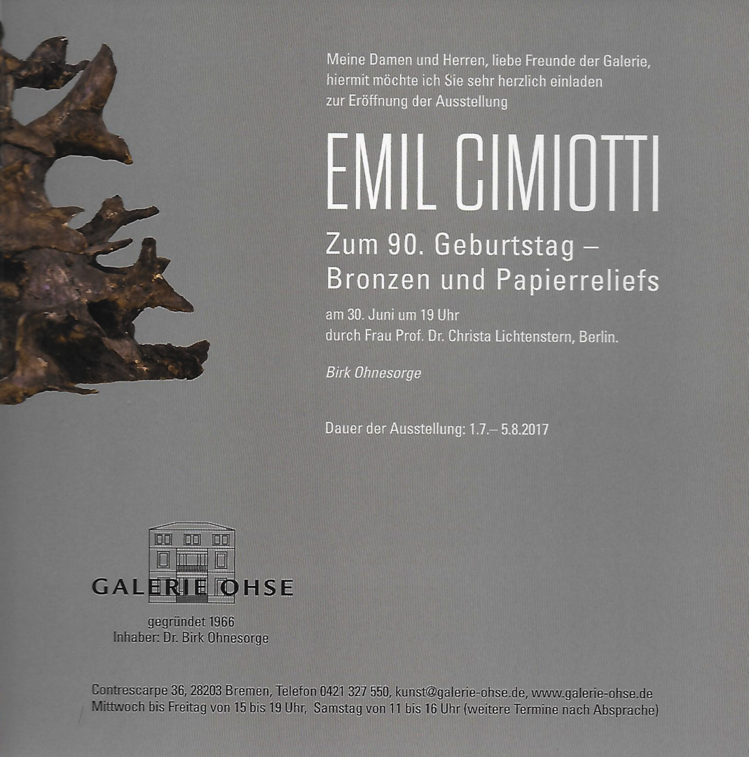 Emil Cimiotti “Emil Cimiotti: “Zum 90. Geburtstag” Hrsg.: Galerie Ohse, Bremen. Inhaber: Dr. Birk Ohnesorge Einführung: Prof. Dr. Christa Lichtenstern 01. Juli 2017 - 05. August 2017 4 Seiten mit zwei Bronzabbildungen (ein Baum, ein Alpha/Flügel).,