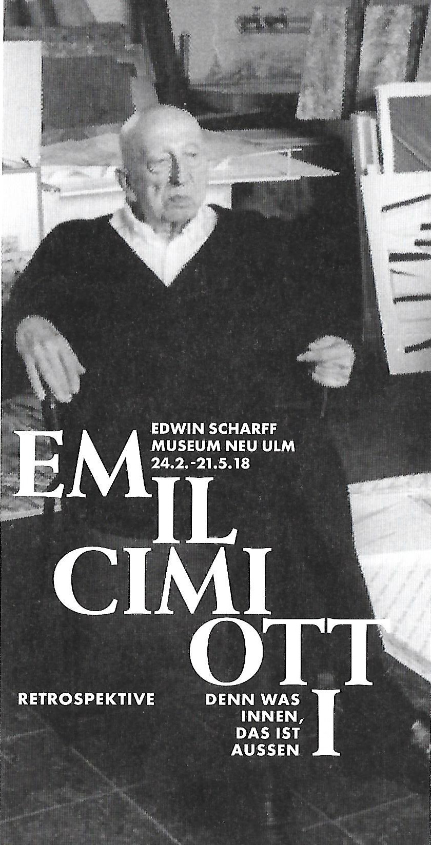Emil Cimiotti “Denn was innen, das ist außen” Große Retrospektive zum 90. Geburtstag Edwin Scharff Museum Neu Ulm 24. Februar 2018 - 21. Mai 2018 Einladungsflyer A, 2 Seiten, 1 Foto. Einladungsflyer B, 8 Seiten, 2 Fotos und 4 Abbildungen.