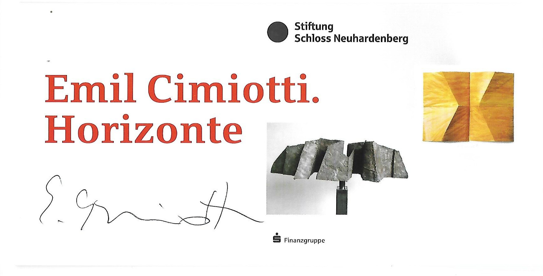 Emil Cimiotti “Horizonte” Stiftung Schloss Neuhardenberg, Neuhardenberg 17. März 2018 - 29. April 2018 Begleitheft zur Ausstellung, 12 Seiten, 8 Abbildungen und 1 Porträtfoto sowie ein Einladungsflyer, 4 Seiten, 1 Foto und 2 Abbildungen.