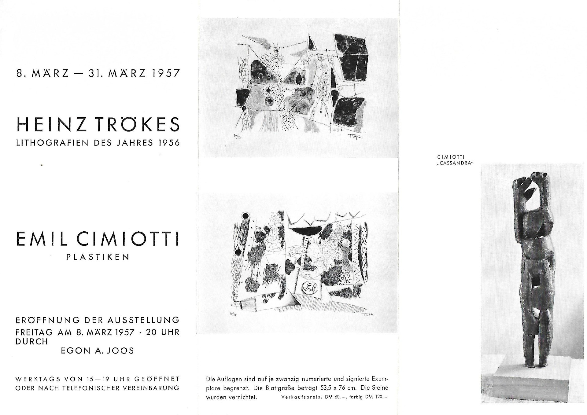 Galerie Inge Ahlers, Mannheim “Heinz Trökes - Emil Cimiotti” 08. März bis 31. März 1957 Flyer, 2 Seiten, s/w. Emil Cimiotti genannt mit 10 Arbeiten (5 Bronzen, ein Gipsmodell, ein Wachsmodell und 3 Zeichnungen) sowie abgebildet mit Bronze “Kassandra” von 1956.