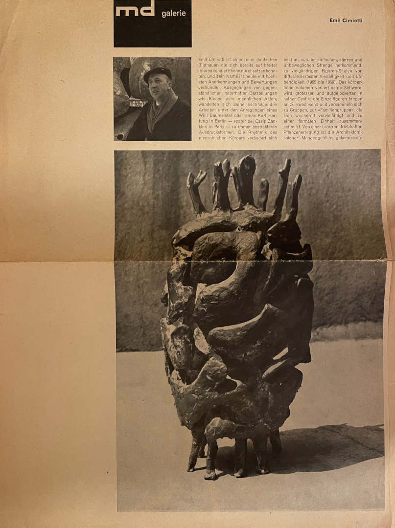 Cimiotti md Galerie Flyer oder Beilage, 4 Seiten. Emil Cimiotti mit zwei Seiten, s/w, abgebildet mit 7 Bronzeplastiken und einem Porträt. (“Figurengruppe XI” 1958, “Der Baum” 1961, “Aeolos II” 1960, “Inselbewohner oder Anderes” 1959, “Schwebende Landschaft” 1962, “Scylla und Charybdis” 1960 sowie “Daphne” 1961)