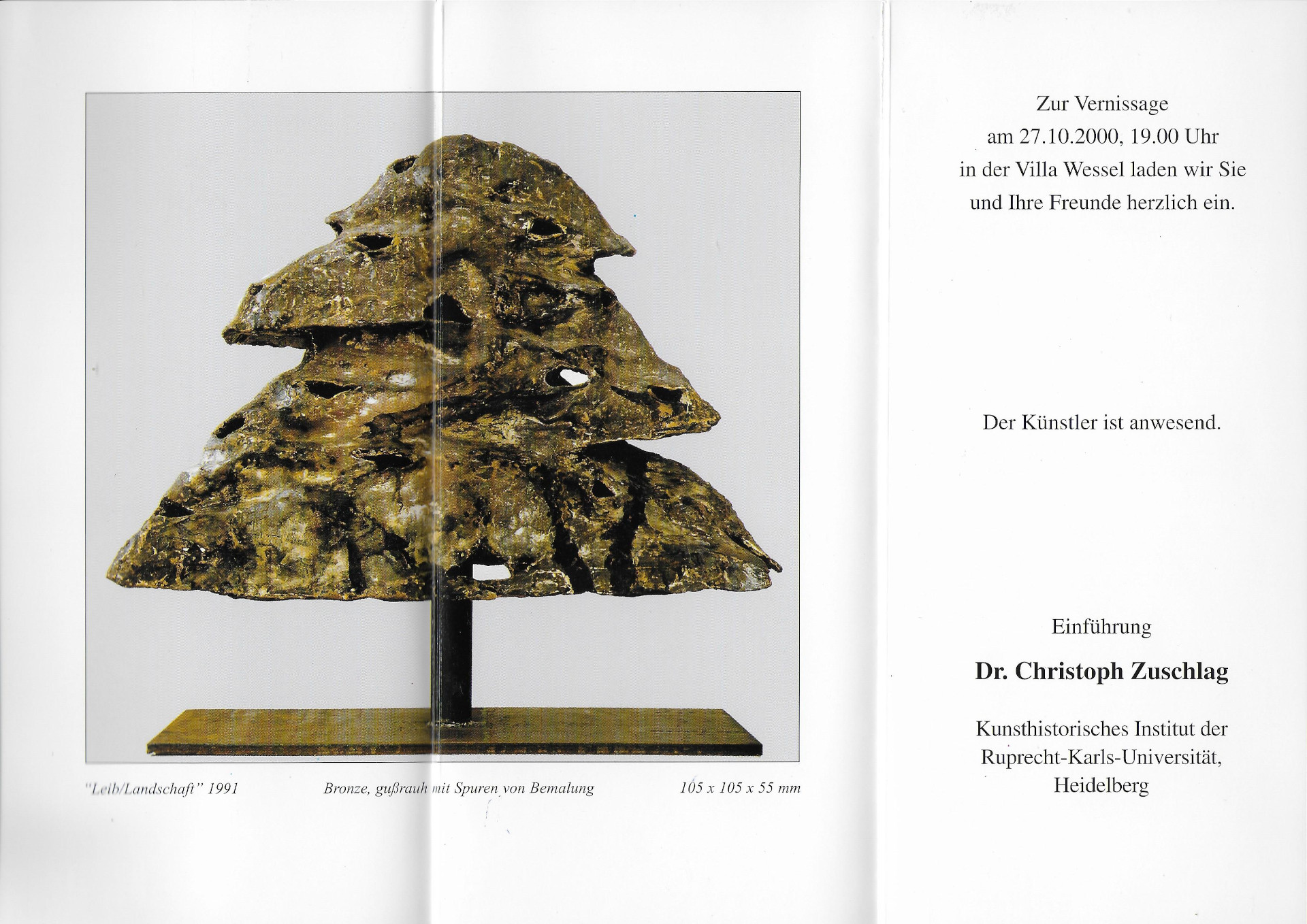 Emil Cimiotti Villa Wessel Iserlohn “Plastik und Zeichnung” 28. Oktober 2000 bis 07. Januar 2001. Flyer, 2 Seiten, abgebildet die Bronze “Leib/Landschaft” 1991. Link.