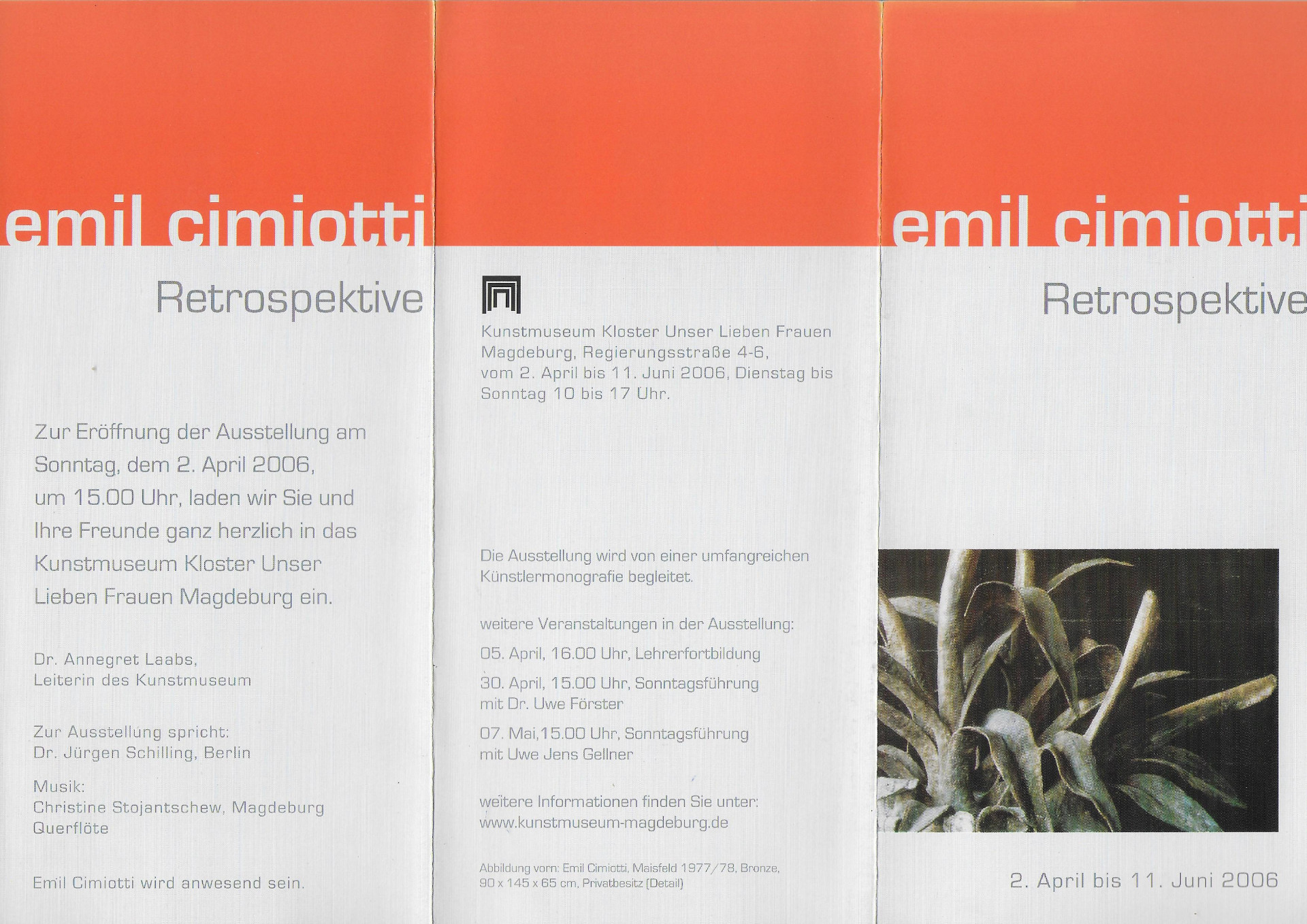 Emil Cimiotti Museum Kloster Unser Lieben Frauen Magdeburg “Retrospektive” 02. April bis 11. Juni 2006 Flyer, 2 Seiten, 4 Abbildungen. 3 Bronzen: “Der Baum” 1961, “Scylla und Charybdis” 1960, “Afrikanisch II, später Gruß an Willi Baumeister” 2002 sowie eine Detailaufnahme.
