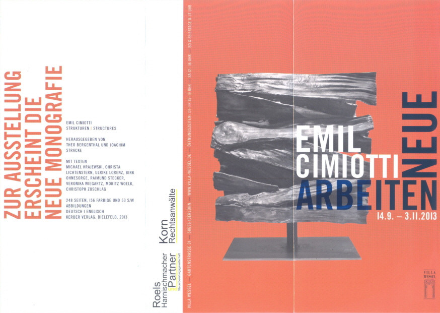 Emil Cimiotti Villa Wessel Iserlohn “Neue Arbeiten” 14. September bis 03. November 2013 Flyer, 2 Seiten, abgebildet die Bronze “Zenith” von 2012. Link.