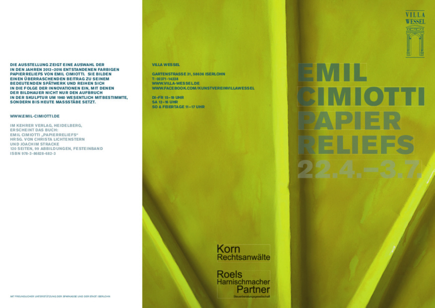 Emil Cimiotti Villa Wessel Iserlohn “Papierreliefs” 22. April bis 03. Juli 2016 Flyer, 2 Seiten, abgebildet “Detail Papierrelief”. Link.