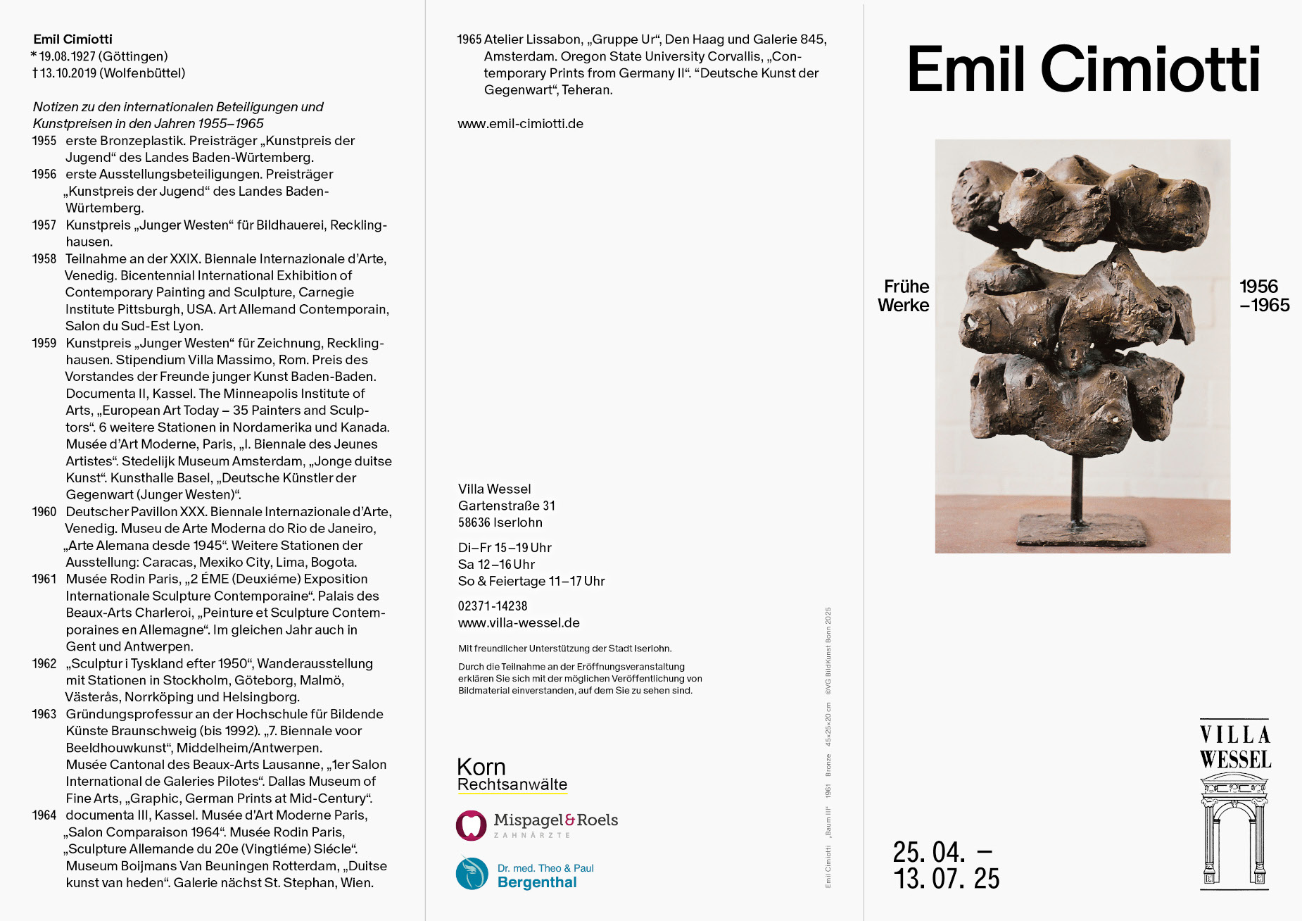 Emil Cimiotti Villa Wessel Iserlohn “Frühe Werke / 1956-1965” 25. April 2025 bis 13. Juli 2025 Flyer, 2 Seiten, abgebildet, Bronze “Baum III” von 1961. Link.